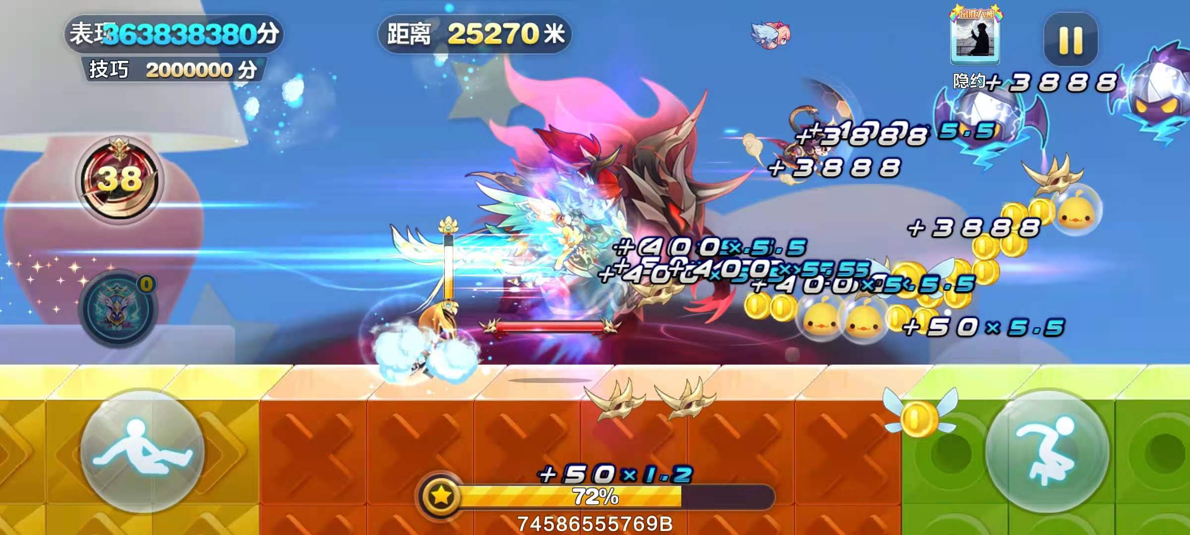 孔雀明王是个偏经典刷距离类型的坐骑,他的技能是在左边的能量条满了之后,会召唤出一个孔雀,孔雀可以清除眼前的障碍物顺便提高大幅度的表现分,吃梨可以积累能量条~能量条满了就可以进入超级奖励关卡~只有在技能结束后再进入超级奖励关卡,可以延时进入超级关卡,因此更适合奖励外关卡冲刺英雄,例如—蚩尤