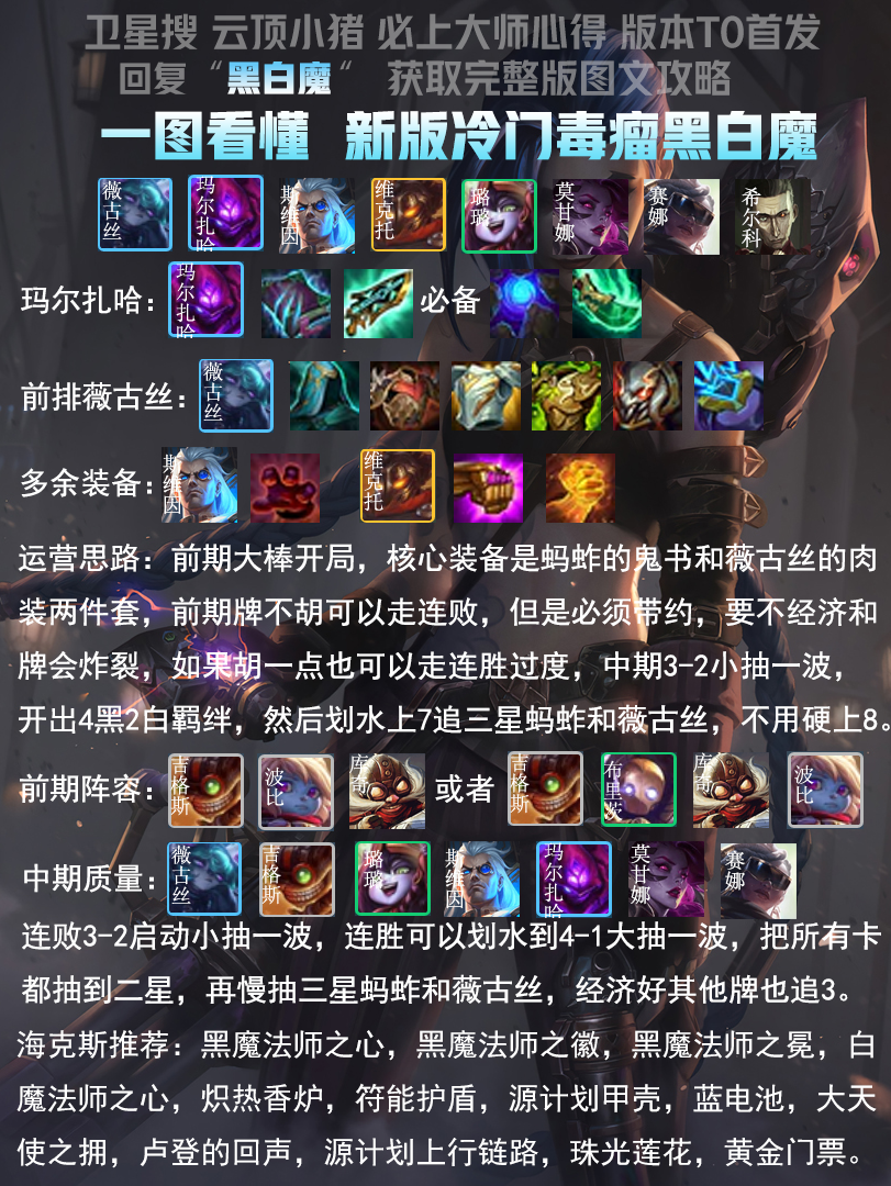 前期大棒开局,核心装备是蚂蚱的鬼书和薇古丝的肉装两件套,前期牌不胡可以走连败,但是必须带约,要不经济和牌会炸裂,如果胡一点也可以走连胜过度,中期3-2小抽一波,开出4黑2白羁绊,然后划水上7追三星蚂蚱和薇古丝,不用硬上8,只要能把蚂蚱和熬夜波比追到三星,吃分非常容易,海克斯对一点就能登顶。