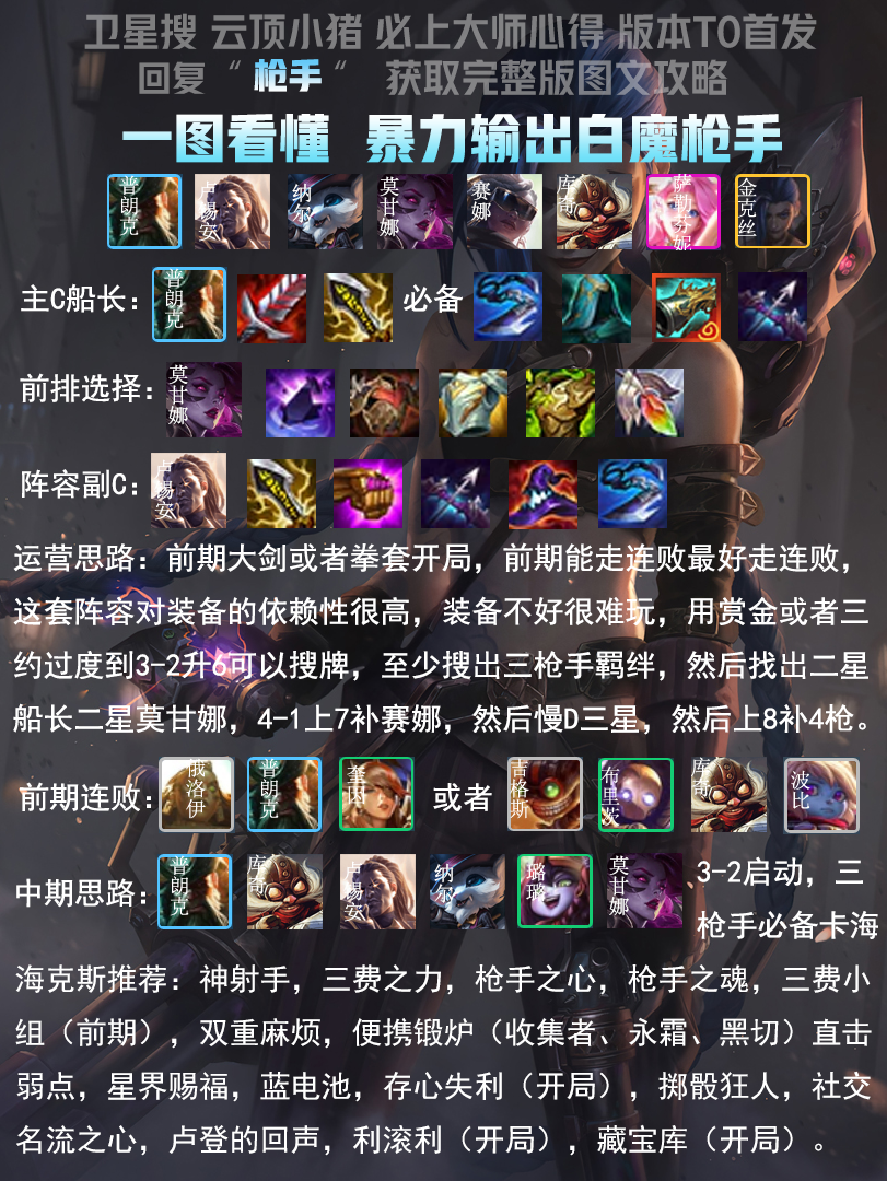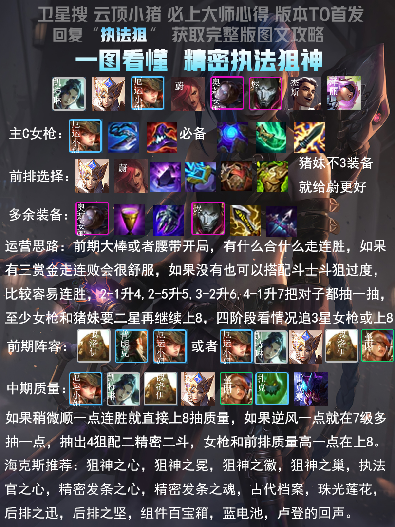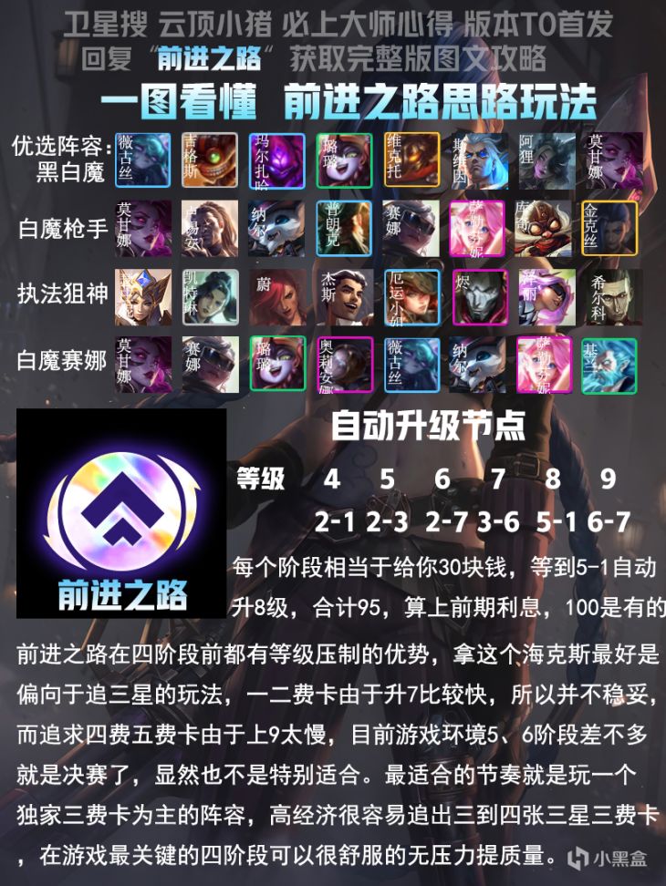 这套阵容非常吃经济,前进之路正好弥补这点,前期大棒或者腰带开局,有什么合什么走连胜,如果有三赏金走连败会很舒服,如果没有也可以搭配斗士斗狙过度,比较容易连胜。四阶段有前进之路正好追3星女枪和猪妹,运气好也能抽出来杰斯和泽丽,抽不出来也没关系,不是特别关键。