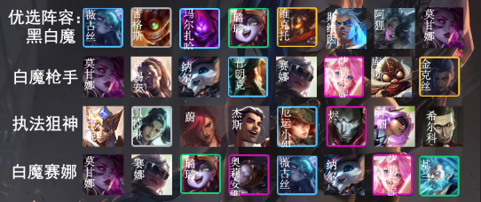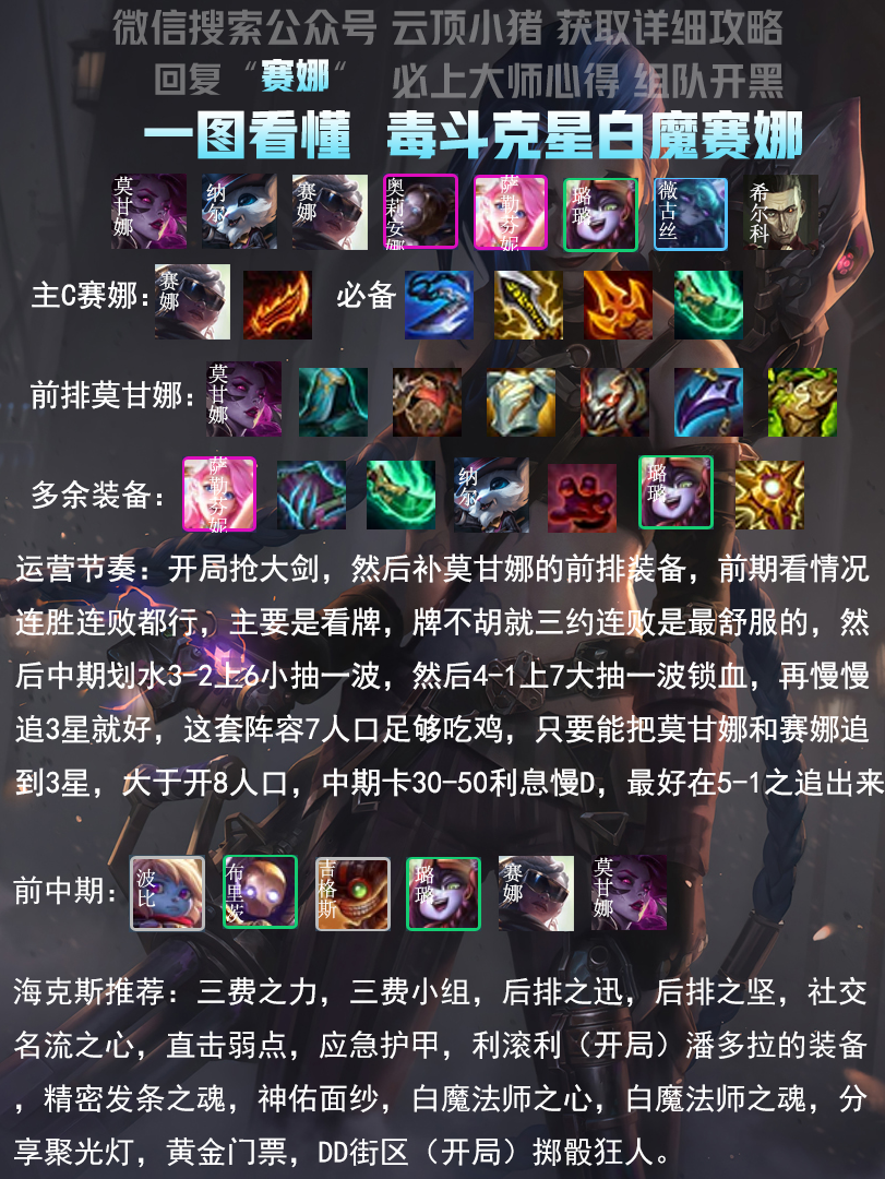 白魔赛娜上上版本是最热门的赌三费阵容,现在这套阵容相对算是冷门了,没有什么同行的压力,前进之路也特别契合这套,不过这套阵容本身相比前面几套战力要差一点,作为前进之路几个主要思路的候选吧。