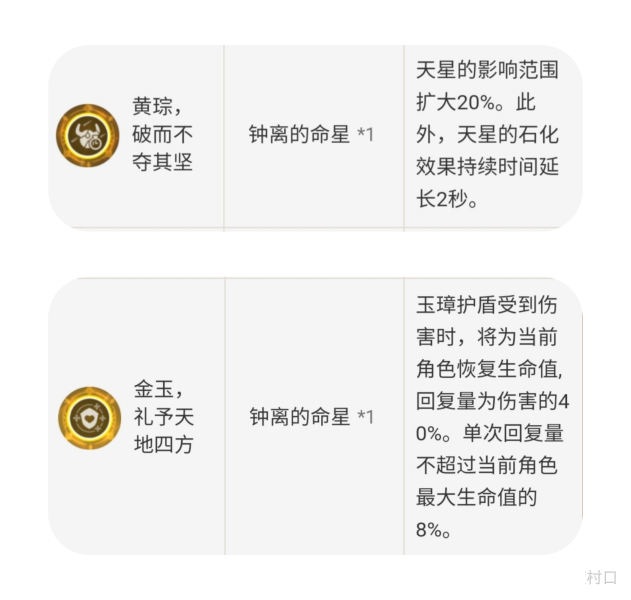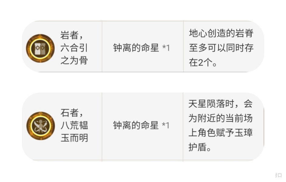 一命解锁岩脊上限,两个。二命开大时会给附近角色套盾。两个命座,实用度都不是很高,但是可以拉高四千岩上限。
