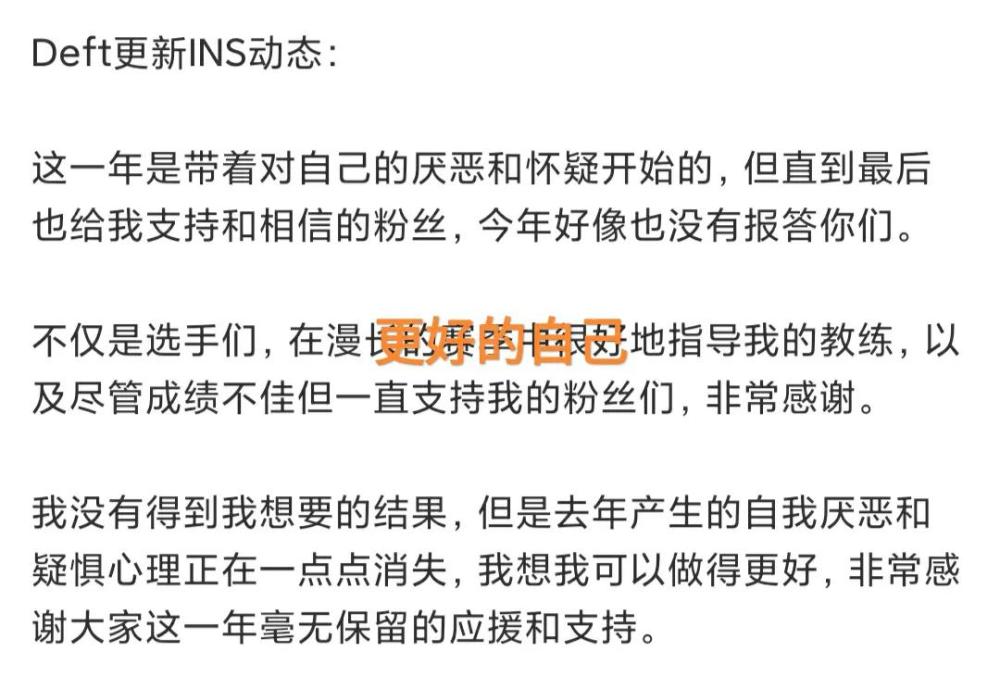 在被淘汰之后,大量的玩家开始关注起来了deft毕竟作为一名老将,他的年纪已经不小了,今年的比赛很有可能是他的最后一年。但是在过生日的这一天里,他公开回应了这个事情,这一年是带着对于自己的厌恶和怀疑开始的,整个一年的比赛结束之后。没有得到自己想要的结果,但是去年产生的自我厌恶的心里正在一点一点地消失,他觉得自己可以在下一年中做得更好。