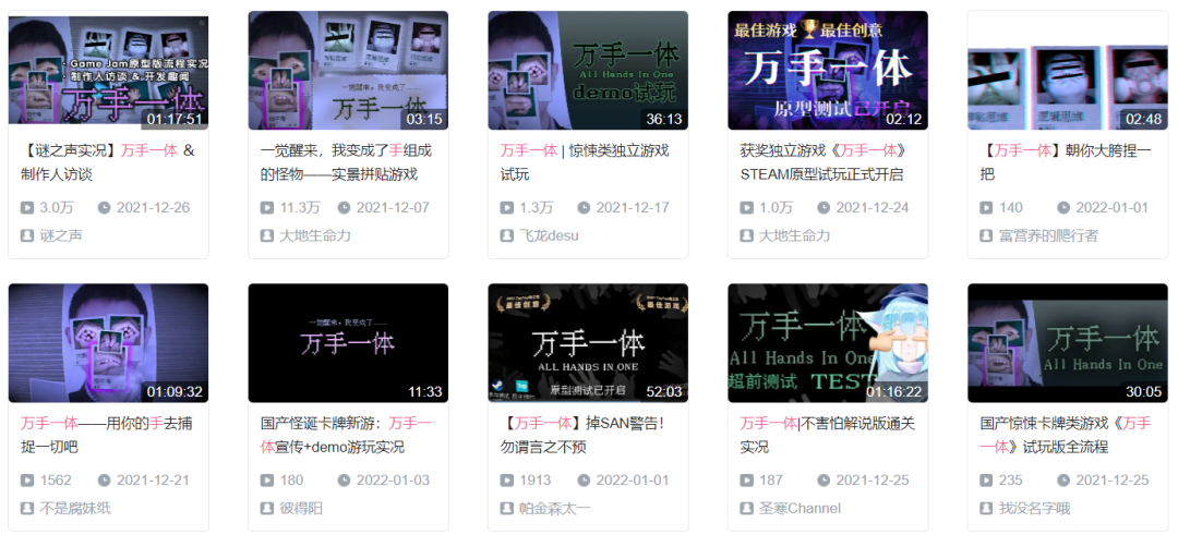 网名“大地生命力”的杨泽宇,正职是独立游戏团队“游戏河”的策划。利用业余时间,他制作了《万手一体》的Demo。随后,他在B站上传了游戏的演示视频。截至发稿,有不少up主都为这款游戏制作了视频,当中包括本届独立营评委、有39万粉丝的独立游戏主播谜之声。另外,游戏目前在某平台上的评分达到了9.2分。