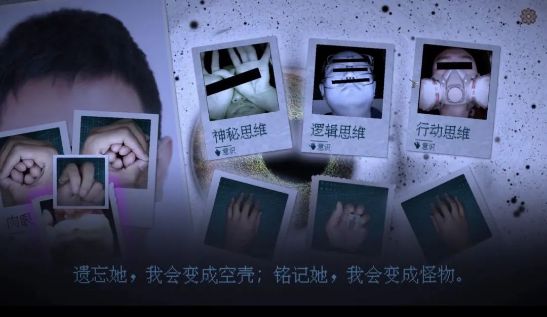 例如,玩家在第一关发现自己变成了“万手一体”后,就会发现游戏留下了关于“她是谁”的悬念;在第二关,玩家不断被潜意识里的三种思维敦促着“想起她”,直到关卡结束,才从“万手一体”的梦中醒来;在第三关,玩家回顾和女孩的往昔,而“她”的身份也渐渐明确。