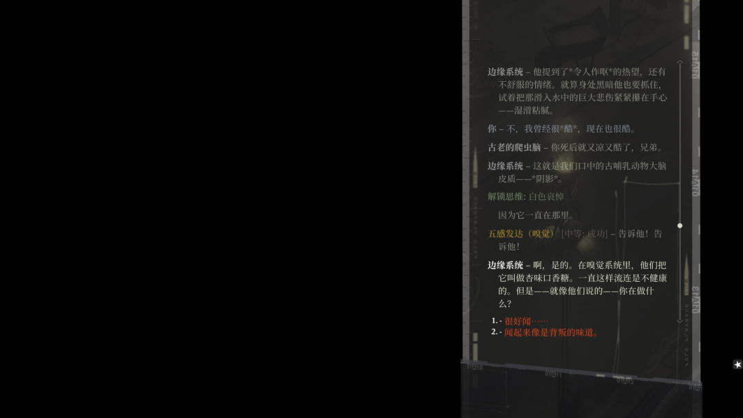 此外,和《异域镇魂曲》《极乐迪斯科》一样,《万手一体》在叙事的整体方向上,有着碎片化的特点。玩家需要在道具描述、对话等文本中抽丝剥茧,才能拼凑出游戏故事的全貌。通过这种独特的叙事方式,《万手一体》讲述了一个关于“她”的情感故事。