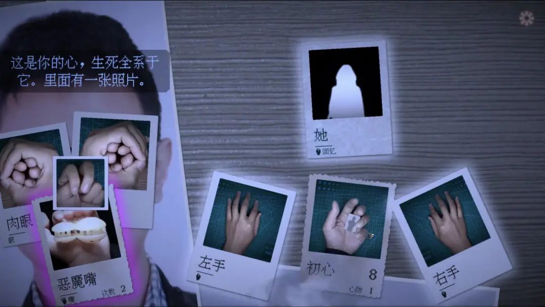 再如表示血量的“心脏”一栏的变化:在第二关,玩家的心脏栏会变为“戒心”,在第三关则是“信心”,到了最后一关则会变为“初心”,且会拥有“心防”。这个变化和关卡的剧情内容正好吻合,表达了主角心境的变化。