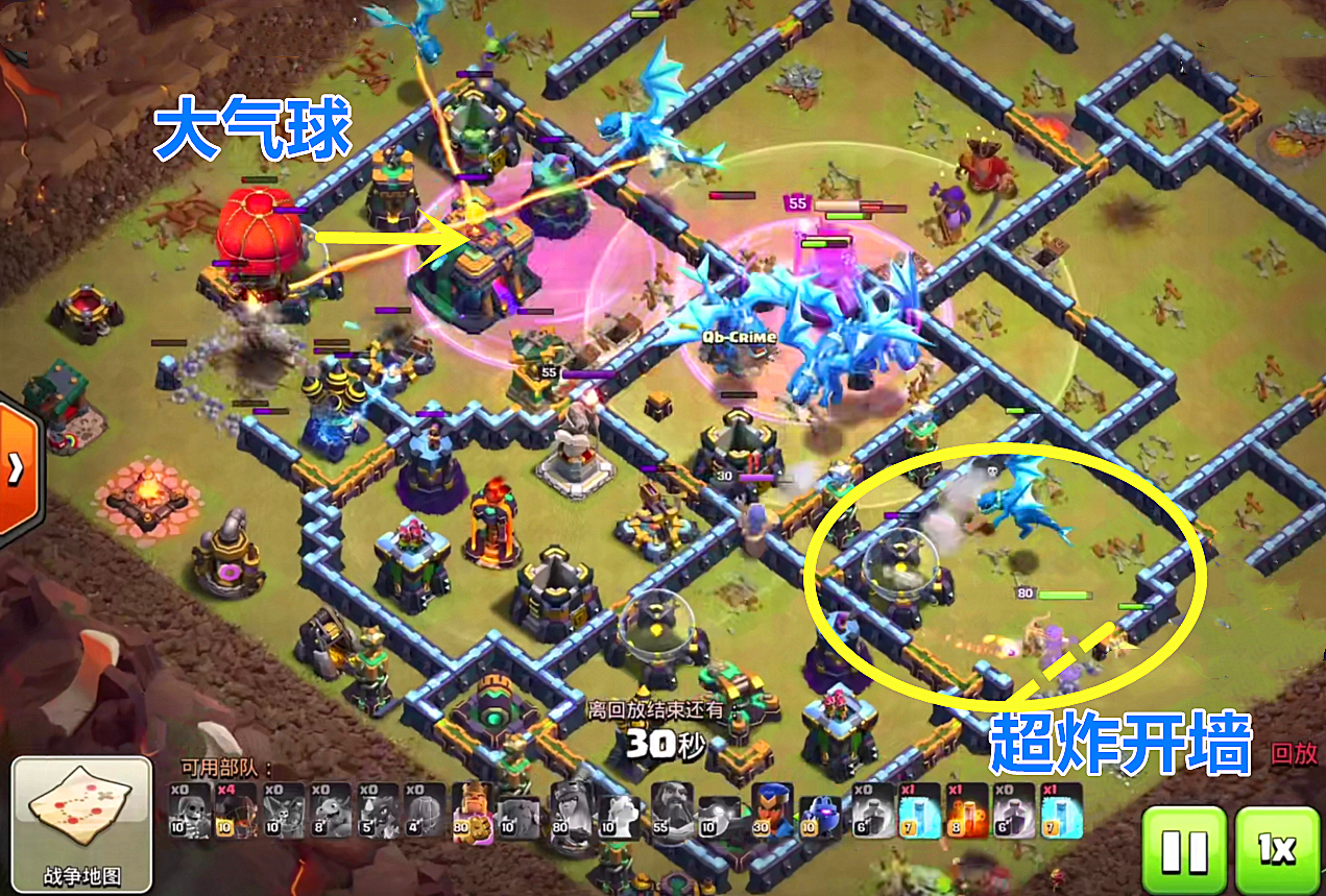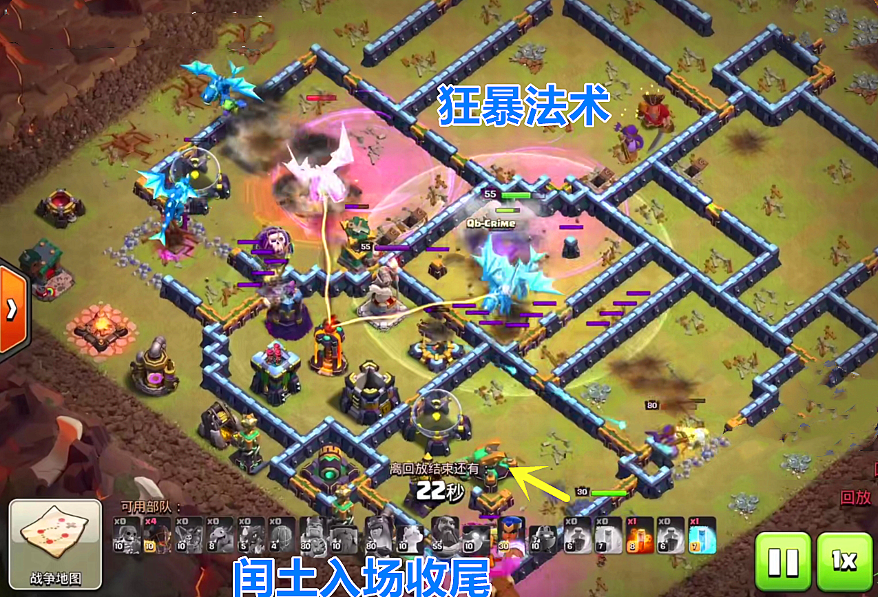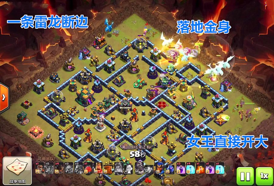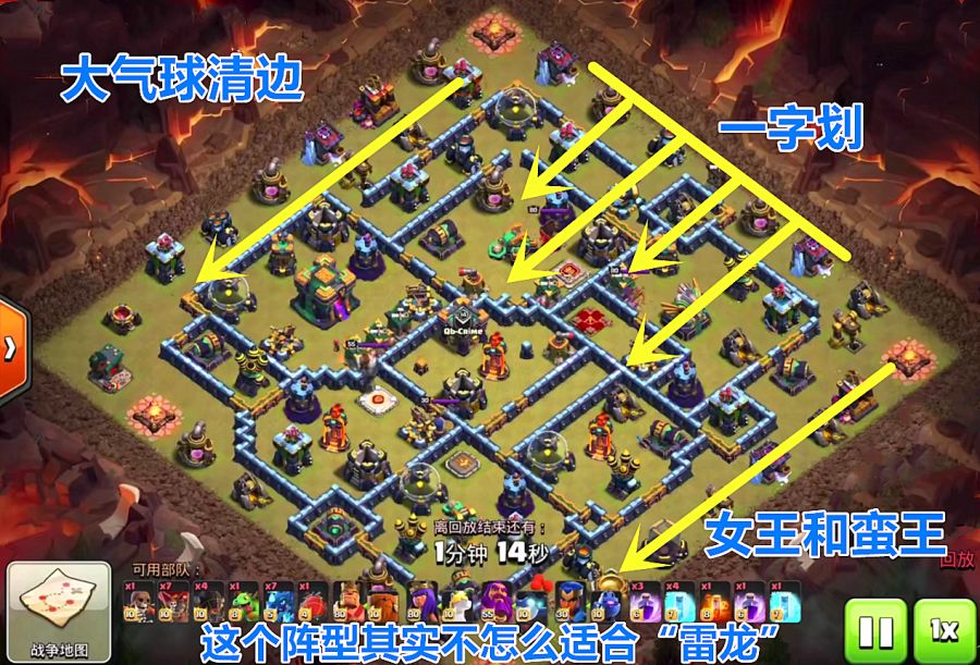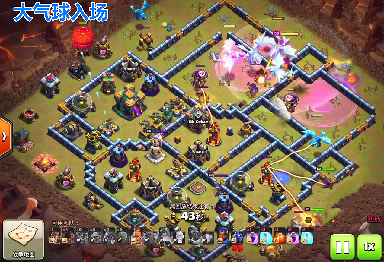 12点钟方向先释放一条雷龙清边,然后在3点钟方向释放女王清边,在女王受到防御建筑的伤害后直接开大招,最后就是雷龙和气球兵“一字划”等到“咏王”入场直接开金身。