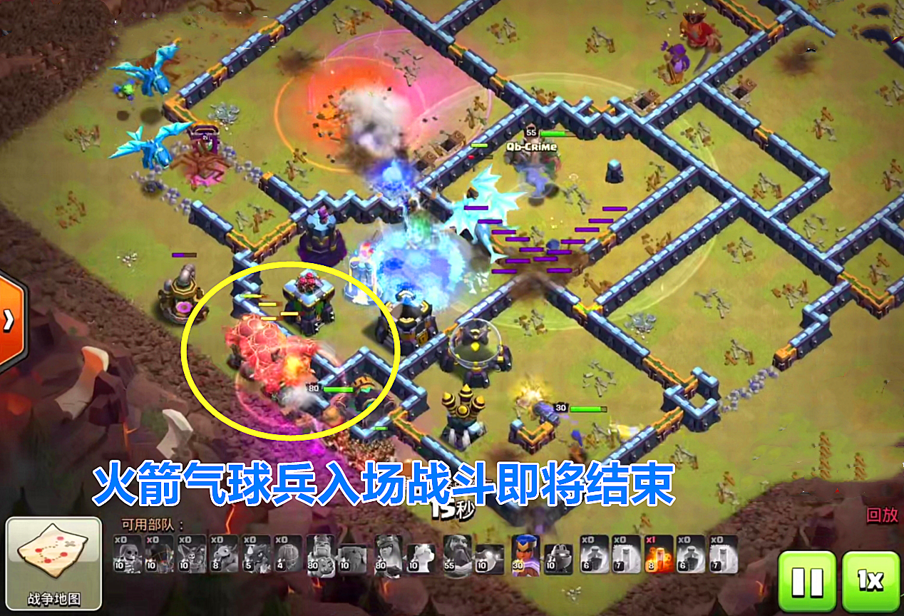 10点钟方向“攻城气球”入场,为身后的雷龙扛伤,也为进攻敌方大本营做好前期的铺垫工作,这两个细节非常地重要,既能保护我方的女王和雷龙,又有非常明确的目的。