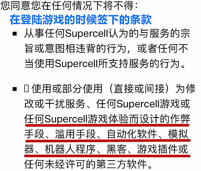 小伙伴们在进入游戏以前,都会签署“游戏条约”你不在“已读”的选项上打“√”连游戏都不能登录,我们先不讨论这是不是“霸王”条款,今天就看一看我们到底“签署”了那些条约。你不得在游戏中使用以下行为:1.滥用手段。2.自动化软件。3.模拟器。4.机器人程序。5.黑客。6.游戏插件或任何未经许可的第三方软件。这个条款最后一句话非常厉害“未经许可的第三方软件”这就已经把所有的路都给你封死了。所以说具备以上任何一点,都是“封停”你游戏账号的理由,因为你已经签署了游戏条款。