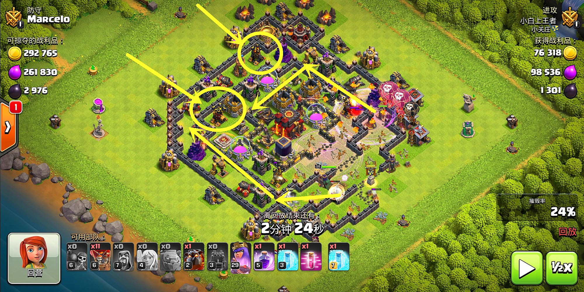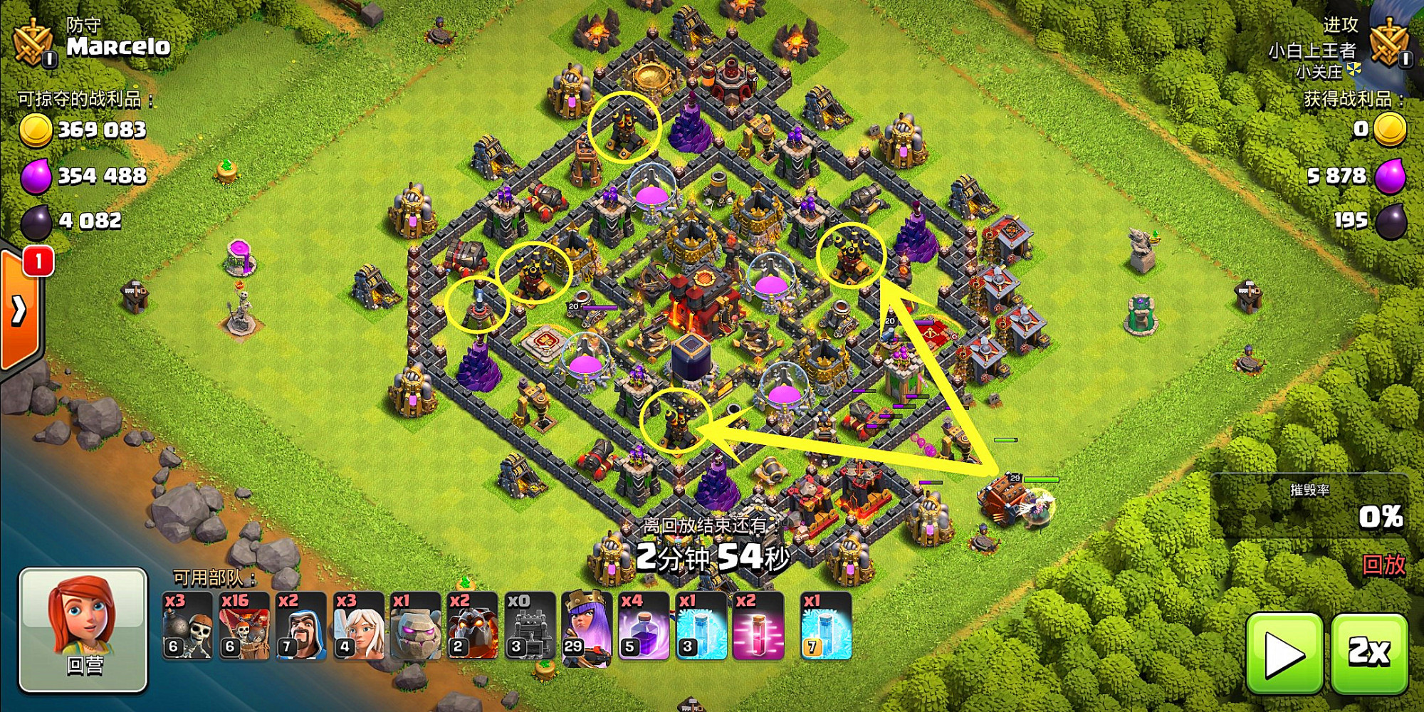 在上图小白罗列出对“气球兵”威胁最大的建筑,所以“天女”前戏势必要尽可能多地打掉以上的建筑,当然这些建筑也是分先后的,第一集团:吹风机、敌方女王、防空导弹和部落城堡。第二集团:法师塔、X弩和多头地狱塔。由于10本的女王和天使受等级的限制,所以要给女王配一个前排(坦克)。