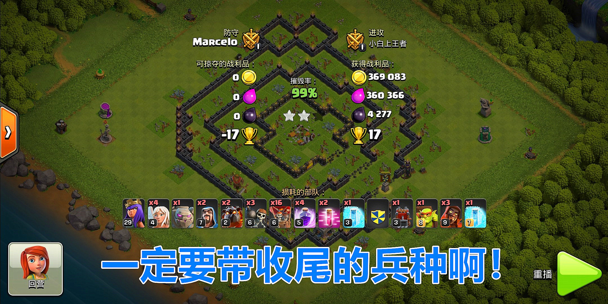 经过无数次一星、两星和黑三后,小白终于有点“悟道”了,狗球流和地面流派的最大区别是,1.要用“熔岩猎犬”拉住防空导弹的伤害。2.气球兵千万不要下多了,一个建筑下3个气球兵为最佳,多了容易伤害溢出,并且还容易被法师塔群伤。3.熔岩猎犬一定要拉开距离释放,千万不要让两只狗飞向同一个防空导弹,这是小白血和泪的经验啊!4.最后一定要留收尾的兵种,因为气球兵的飞行速度太慢了,2星99的摧毁率,真的是太感人了。