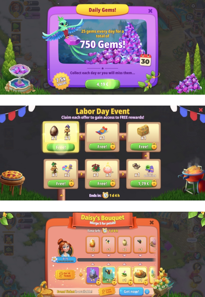 众所周知,当你合并5个物品而不是3个物品时,合并会更加强大,你可以为此得到额外奖励。合并到《Merge Gardens》新版本成功的第五个物品也广泛出现在了在线运营活动和变现当中。