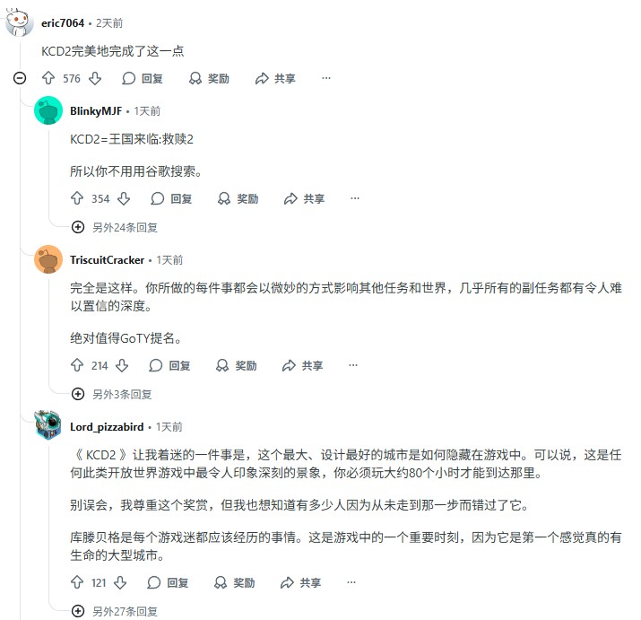 GameLook注意到,评论区频繁提及《天国:拯救》系列作为正面范例。这款游戏中的NPC拥有极其丰富的行为树,甚至拥有一套完整的作息系统——夜晚他们会将衣服整齐地放在木箱中,上床安睡,清晨起床生火做饭。玩家的行为也会引发NPC的真实反应,如果衣服太久没洗,他们会毫不客气地抱怨“你是不是馊了”。