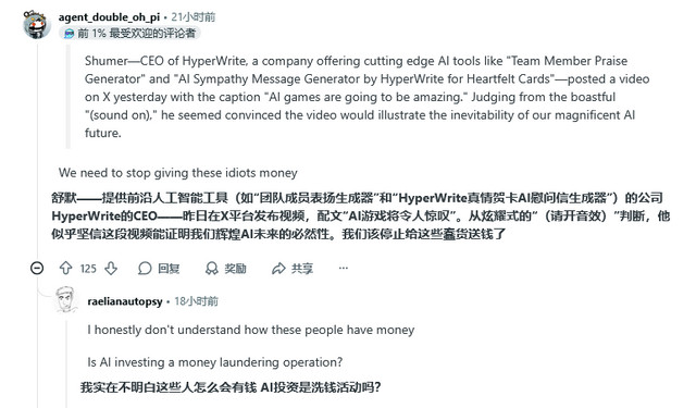 有评论讽刺道:“我们应该停止为这些人送钱了”“AI投资是什么洗钱的骗局吗?”