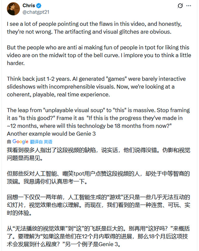 当然,也有另一部分观点认为,尽管视频效果“惨不忍睹”,但其背后的技术探索值得关注。支持者表示,这可能只是一个非常早期的技术原型(v0.1),其意义不在于当前的视觉呈现,而在于AI“试图”实时生成一个可交互的3D空间,以及最近几年以来,AI在想各领域的飞速进步。