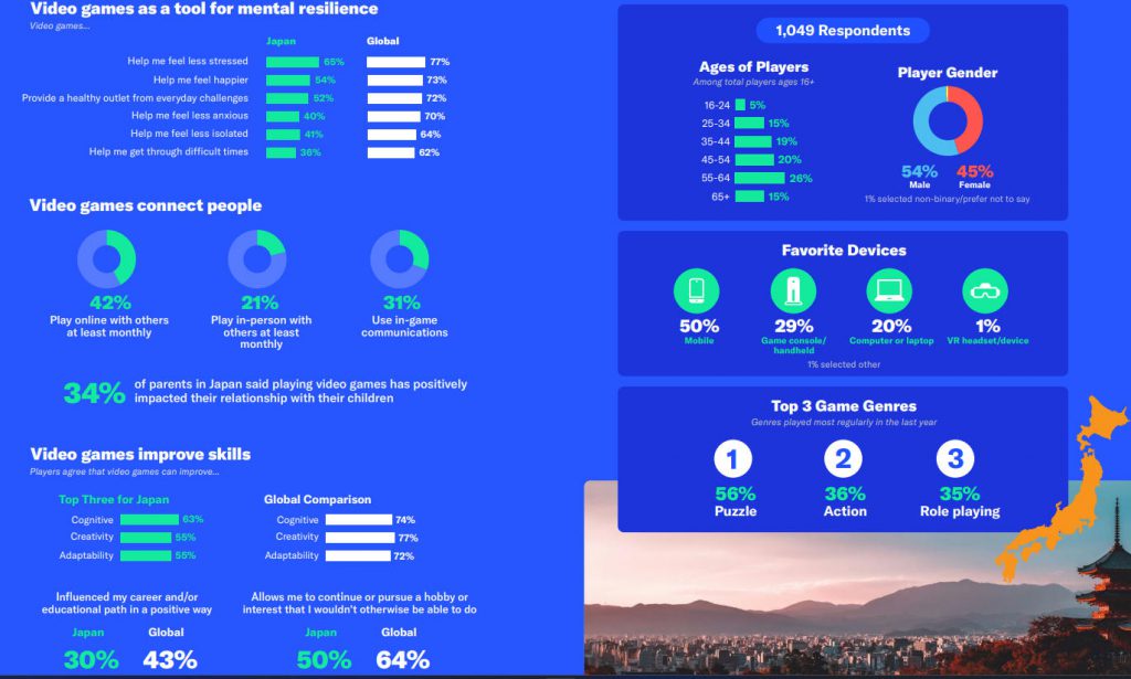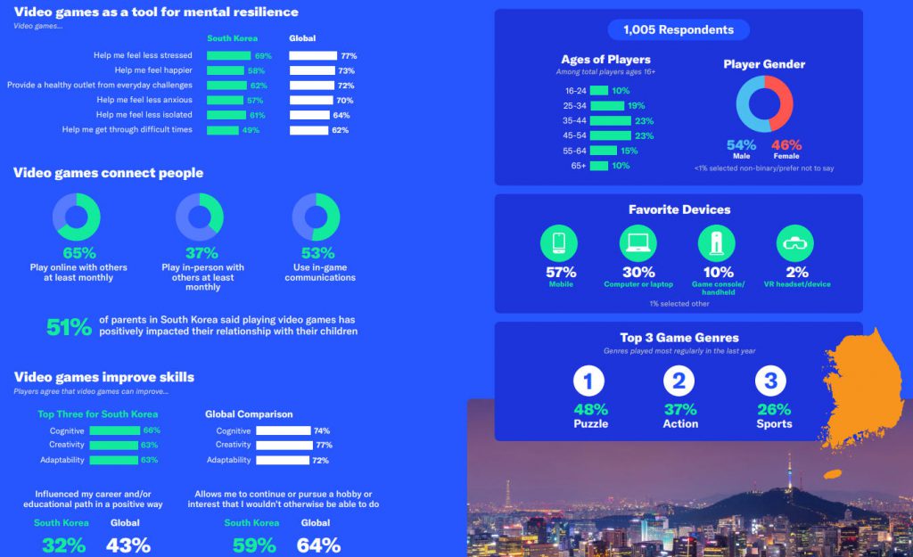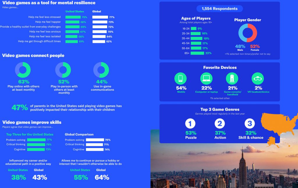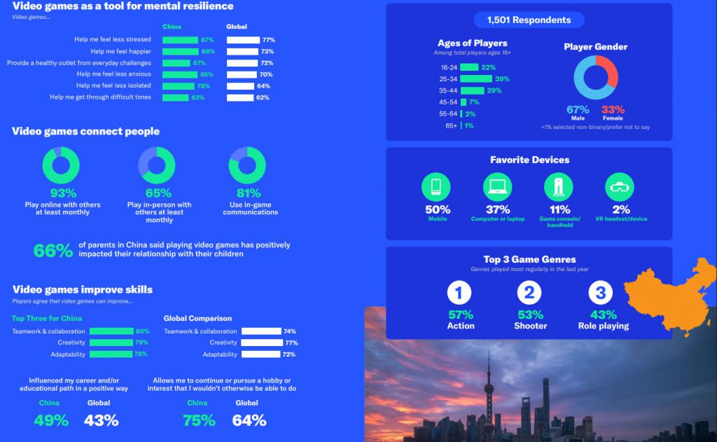 我们确认,享受乐趣是全世界玩游戏的首要原因,游戏还能帮助玩家减轻压力,帮他们度过困难时期。玩家们还认识到,游戏能够培养解决问题的能力、团队合作、适应性和批判性思维等技能。