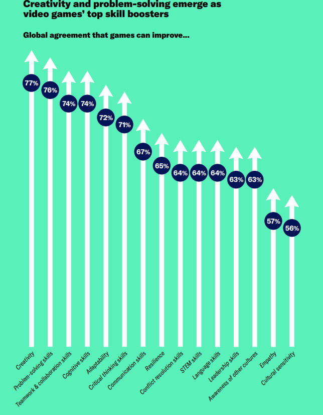 调查结果显示,全球玩家普遍认为游戏能够带来全方面的技能提升,比如70%以上的用户表示,游戏可以提升创意、问题解决技巧、团队协作技巧、认知技能、适应性以及批判思维能力。