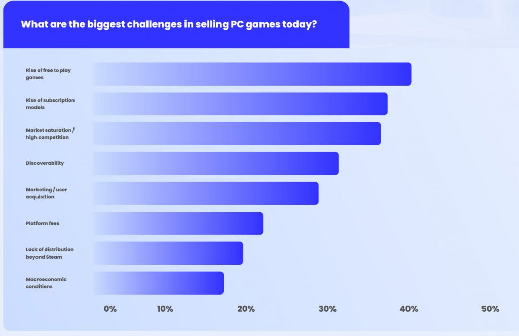 在被问及如今的PC游戏销售挑战的时候,40%的开发者认为免费游戏的兴起、订阅模式、市场饱和、买量/营销以及曝光率的下降是最大的几个挑战。