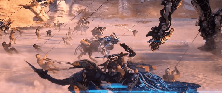 这似乎预示着,《钢铁边境》在继承IP核心元素的同时,将在战斗方式上做出更大胆的突破。随后的场景也印证了这一点:部落民众合作狩猎“长颈兽”,主角则骑着“劫掠者”在雪原飞驰,甚至驾驭“水翼兽”加入战场。