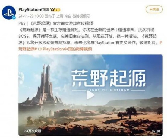 但在最初的宣发阶段,索尼PlayStation中国的官方社交媒体账号曾转发《荒野起源》的宣传物料,并确认该游戏未来将登陆PS5平台。这一幕,在当时看来,仿佛是两大巨头一次心照不宣的默契。