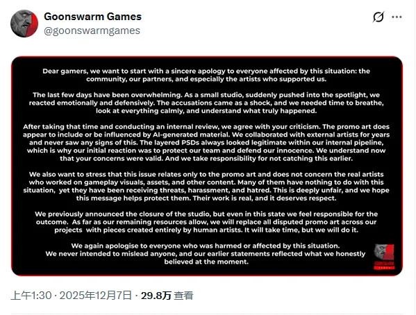 这一决定的连锁反应是残酷的。随后Goonswarm Games方面报告称,经内部调查发现,外包的宣传艺术作品中可能使用了生成AI。同时就在项目宣布取消的当天,处于舆论风暴中心的开发商 Goonswarm Games 宣布关闭工作室。