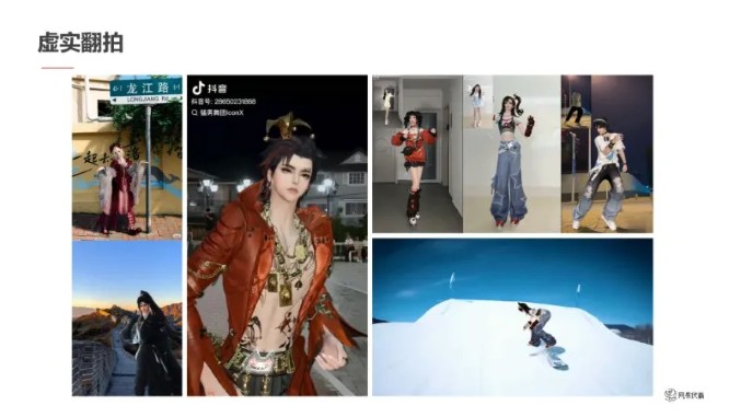 这是单人跳舞过程中的运镜,上面两个是静态结果,就是一些抽象表情包结构。我们发现挺有意思一点,虽然提供了很多拍短剧功能,但大部分玩家还是选择拍自己跳舞,或者自己跟游戏其他人物互动跳舞,或者比较简单的互动、截图。感觉这个趋势和抖音挺一致,大家都可以“秀”跳舞。