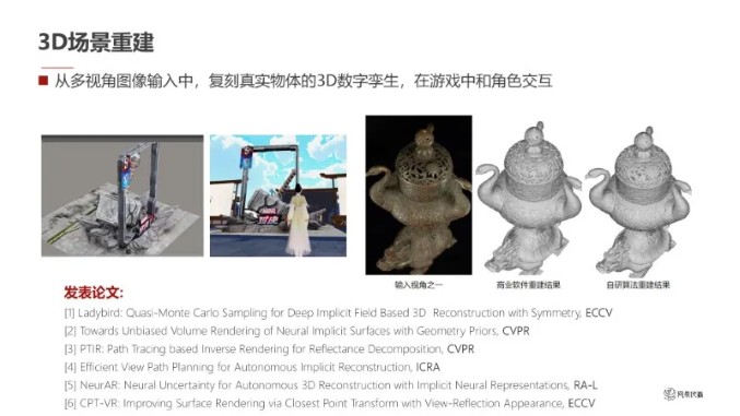 我们在这方面做了比较多研究工作,把针对 Corner Case(长尾/极端情况)做优化。比如青铜器带反光的东西,用传统工艺重建其实做的不会太好。我们会针对反光物体或者镂空物体做进一步技术研究,做整个高精度物体生成。