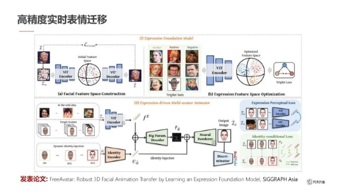 表情迁移方面,我们做了比较有意思的创新。以前大家做表情迁移,大多是用人脸关键点 —— 检测眼角、嘴角这些点,然后让游戏角色跟着动。但这种方式有个问题,动作和我们实际感受到的表情可能不一样,而且遇到二次元角色、动物角色,连关键点都检测不到。