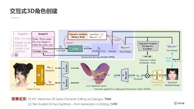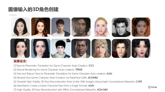 我们从 18 年已经开始研发,当时技术还没那么成熟,AI 大模型还没发展那么兴盛。当时我们更多是用大模型之前的那波传统神经网络的方案:通过图像生成 3D 参数,结合相似度判别信息,看它和玩家输入是否相似,再去梯度反向传播,迭代优化。这么多年下来,我们一直在改进技术结构,现在这套方案已经越来越完善,相关的研究成果也发表在了 ICCV、TPAMI、AAAI 等不少国际顶会上。