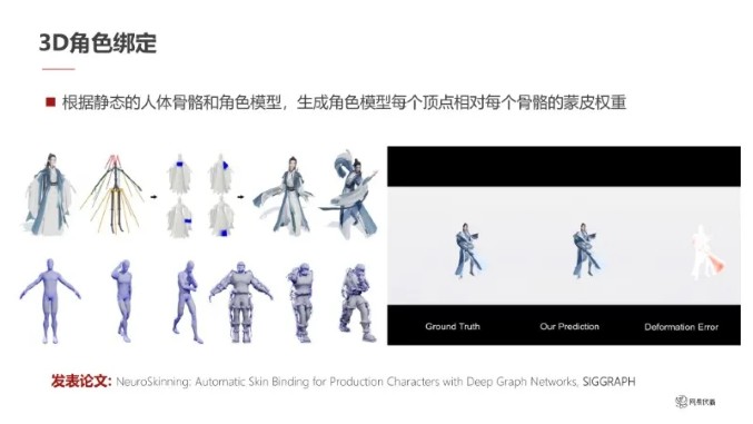第二部分是 3D 角色智能驱动。这一块我们首先做的是 3D 角色绑定(Rigging)骨骼。简单说就是根据静态的角色模型和游戏内统一的骨骼,生成模型每个顶点相对骨骼的蒙皮权重。这项技术我们最早在 2019 年就发表在了 SIGGRAPH 顶会上,后来把它做成了游戏生产环节的自动化工具。之后,腾讯等行业同行也陆续推出了类似的工具,现在 AI 智能绑定已经成了行业里普遍在用的生产环节。