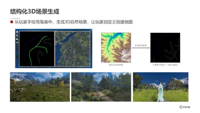 这边我们做了玩家地形生成,也是结构化系统。玩家可以通过简笔画形式画自己想要的地图,画简单几条曲线,比如道路、水、山。AI 会根据真实卫星高程图的学习数据,生成包含植被、桥梁的完整 3D 自然场景,玩家还能在自己创建的场景里互动、浏览。