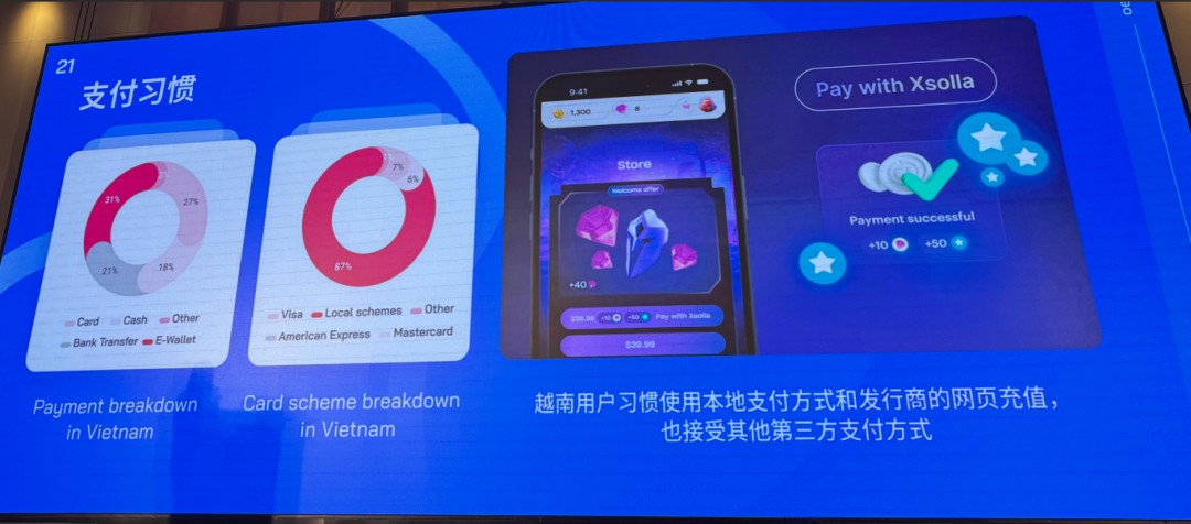 越南用户重视第三方渠道,通常通过第三方充值。如果产品表现好,第三方渠道占比可达 70% 到 80%。支付方式主要包括点卡、电子钱包和银行卡等。文化因素也非常重要。无论是在配音、客服还是游戏内容中,融入本地文化元素都至关重要。例如,结合当地节日设计游戏活动,会更受用户欢迎。