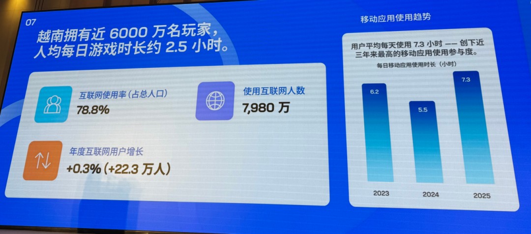 越南互联网用户已达 7980 万人,占总人口的 78.8%,且持续增长,年均增长率约 0.3%。越南用户有强烈的移动应用使用习惯,平均每天使用手机超过 7 小时,这是近三年来的最高使用水平,反映出他们对数字娱乐的深度参与。同时,游戏玩家总数已达 6000 万人,平均每天玩游戏超过 2 小时。游戏不仅是娱乐方式,已成为越南用户生活的一部分。