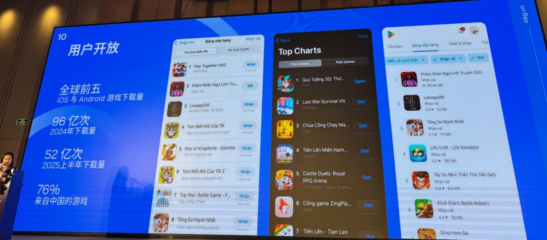 如果关注越南市场,大家可能知道越南主要通过两大平台上架游戏:Google Play 与 App Store。值得注意的是,越南在全球游戏下载量中排名前五,仅 2024 年就有 96 亿次下载,2025 年上半年已达 52 亿次。其中 76% 的产品来自中国,这充分说明中国游戏在越南市场具有重要影响力。