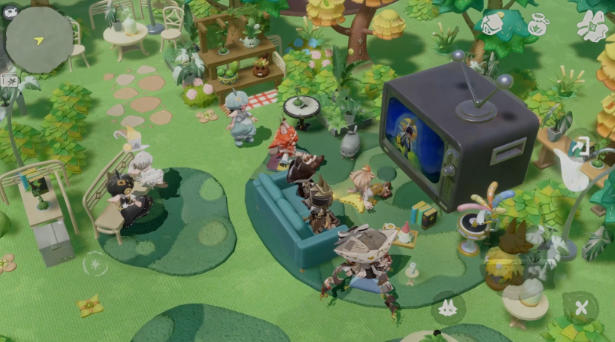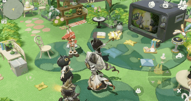 社交方面,《代号:Lovania》的联机玩法也较为克制,并非是MMO式多人社交,更像是几个密友的家中聚会。像是两三人携手探索地图、共同飞行和钓鱼,好友串门、大家一起围坐在电视前……从视频展示画面来看,多人联机至多不超过十人,这也契合了当代年轻人喜爱的小范围社交。