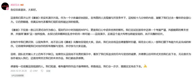 从制作数字资产到开发一款拥有完整叙事和战斗系统的单机ARPG,这中间的跨度无异于天堑。官方在B站评论区的回应也印证了这一点:“墨家是个较难驾驭的题材,我们需要先确保剧情世界观价值观的完善。”对于一个初创的小体量团队而言,要在资金有限、人才紧缺的情况下,驾驭如此宏大的历史题材和复杂的动作系统,确实是一次近乎“自杀式”的冲锋。