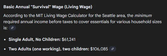 根据MIT的测算,西雅图单个成年人最低的生存薪资为税前61241美元