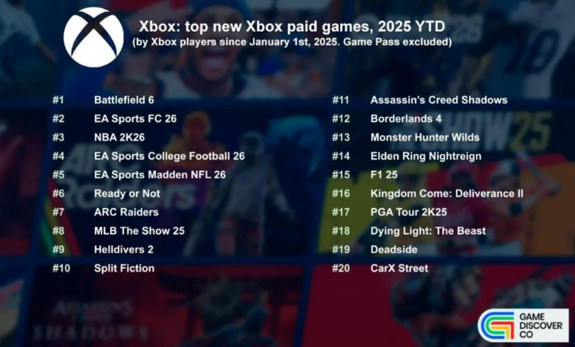 接下来,快速浏览一下2025年Xbox主机付费新游戏的Top 20,与PlayStation平台类似,体育游戏占据了垄断地位,但也有像《严阵以待》和《ARC Raiders》这样的射击游戏在Xbox核心玩家中有相当高的人气。