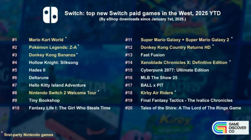 最后,我们来看2025年Switch eShop新游戏(专注于西方市场)的销售情况。考虑到任天堂平台第一方游戏的盒装版销量较高,因此这个榜单显然对老任的第一方游戏不利。不过,Top 20中仍有八款是任天堂发行的游戏。