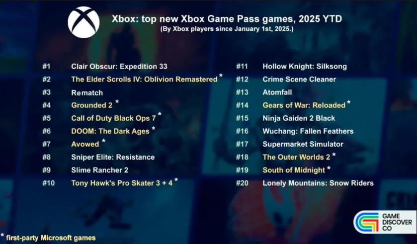 考虑到微软对于订阅服务的重视,Xbox Game Pass的游戏同样值得关注,其中,《光与影:33号远征队》是2025年第三方Game Pass游戏中下载量最高的。(它与《湮没重制版》在最新GP游戏受欢迎度上不相上下。)