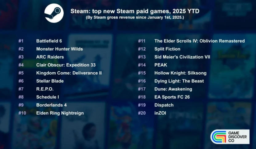 2025年收入最高的20款新游戏依次是:《战地6》、《怪物猎人:荒野》、《ARC Raiders》、《光与影:33号远征队》、《天国降临:拯救2》、《剑星》、《R.E.P.O.》、《Schedule I》、《无主之地4》、《艾尔登法环:黑夜君临》、《上古卷轴4:湮没重制版》、《幻裂奇境》、《文明7》、《PEAK》、《空洞骑士:丝之歌》、《消逝的光芒:困兽》、《沙丘:觉醒》、《EA Sports FC 26》、《Dispatch》和《inZOI》。
