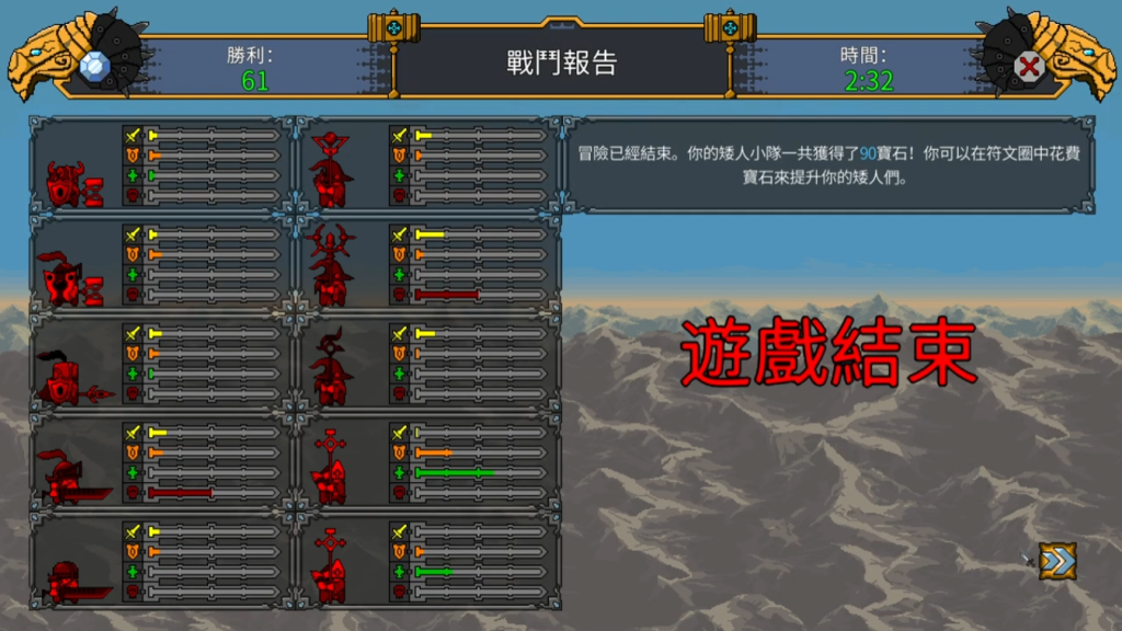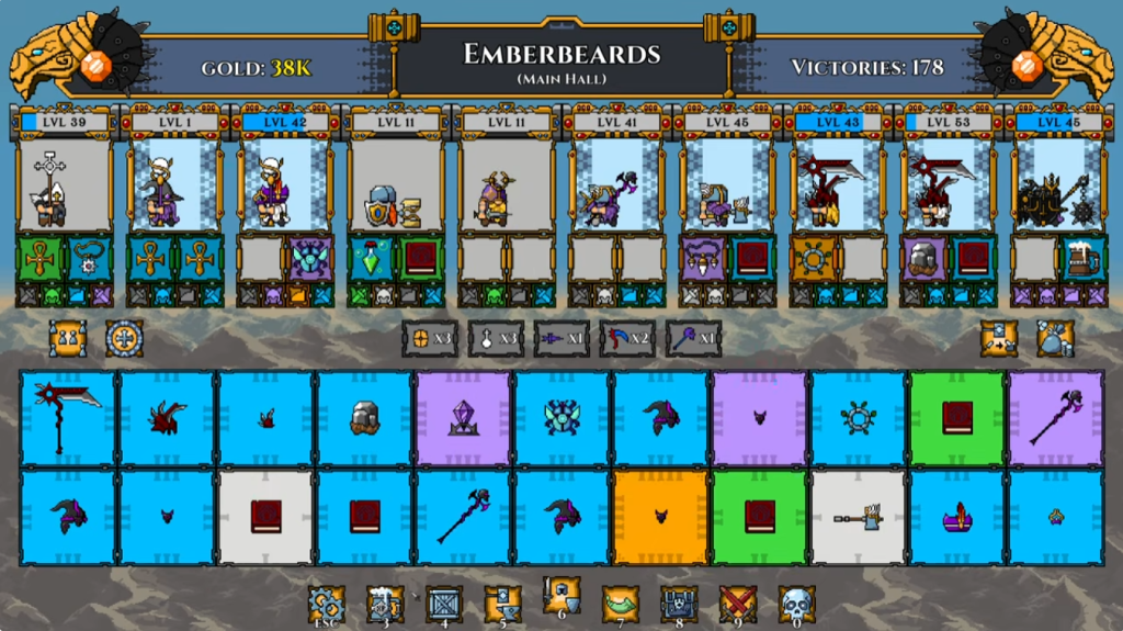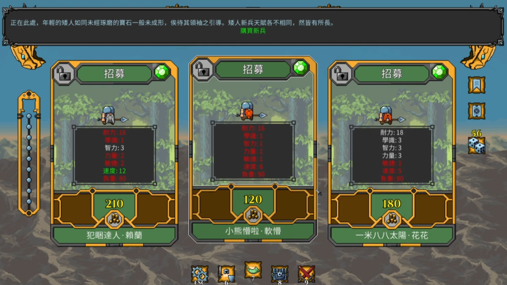 玩家初始仅拥有2–3名基础矮人,其他组成军团的矮人则要通过游戏掉落的金币招募,这些矮人每位都具备固定初始属性(力量、敏捷、智力),但无固定职业。真正的定位由所持装备决定,策略弹性极大。更关键的是,每位矮人可独立升级技能书(通过战斗获得的宝石解锁被动增益),形成高度个性化的成长路径,而非千篇一律的“三星主C”。
