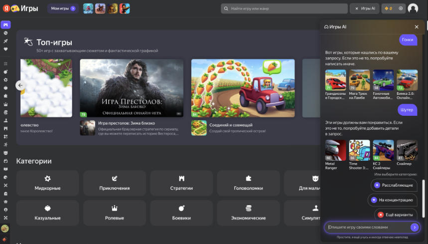 用户体验层面,平台修改和改进了推荐,以便玩家快速找到他想要的游戏,开发者找到目标受众。此外,Yandex还提供了AI助手,可以帮助玩家寻找有趣的项目。通过对平台主页面设计和界面的修改,该公司也开始更加关注游戏赛事和常态化运营。