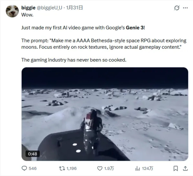 2.“AI+游戏”(革命派): 即Genie 3代表的方向,完全基于AI大模型为基座,游戏不再是代码写出来的,而是AI实时“算”出来的。