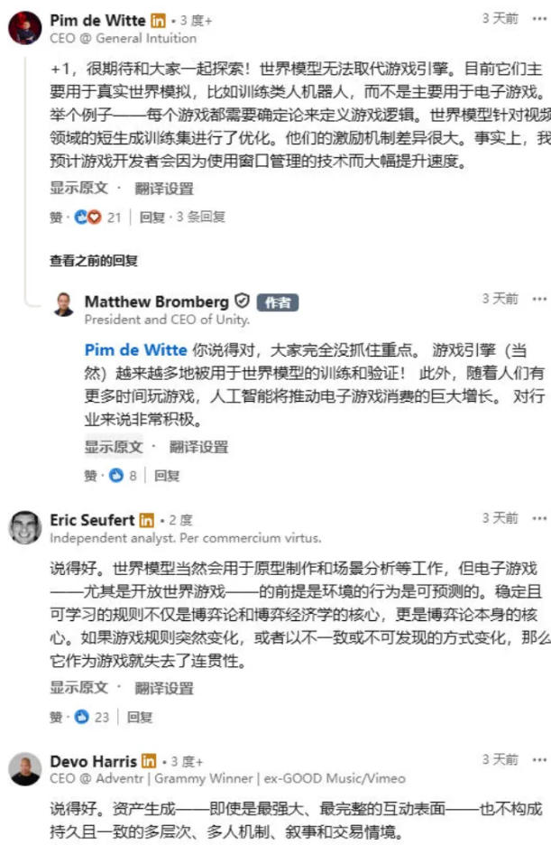 随后,Unity老板坐不住了,Unity CEO Matthew Bromberg紧急“救场”,他在自己的社交媒体发文,称Genie 3对Unity而言不是风险,而是一个强大的加速器,“我们认为,这代表着整个行业在AI驱动的开发方面迈出了有意义的一步。”