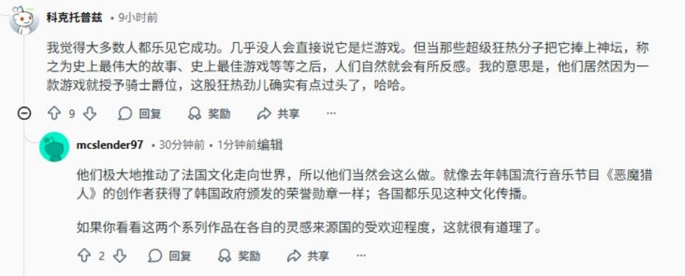 有人直呼“这真挺酷的”,认为法国人终于把游戏当成正经文化来对待了——毕竟,连总统都愿意为一首K-pop神曲创作者授勋,凭什么一款“叙事史诗级”游戏不能拿个骑士头衔?