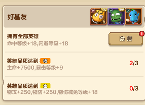 开局送的哀木涕,劣人,呆贼能够凑出【好基友】三人品阶都提升到橙色时会激活二级效果,大幅提高生命7500,保证前期的生存问题,为主线的推进保驾护航。