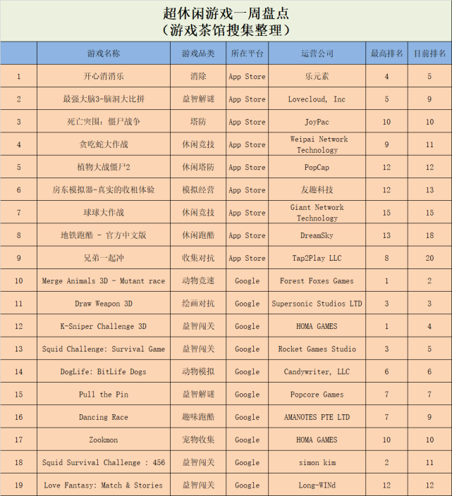 超休闲游戏方面,在App Store免费游戏榜单,乐元素《开心消消乐》连续第二周稳坐榜首。在Google Play免费游戏榜单中,竞速游戏《Merge Animals 3D - Mutant race》登上榜首。