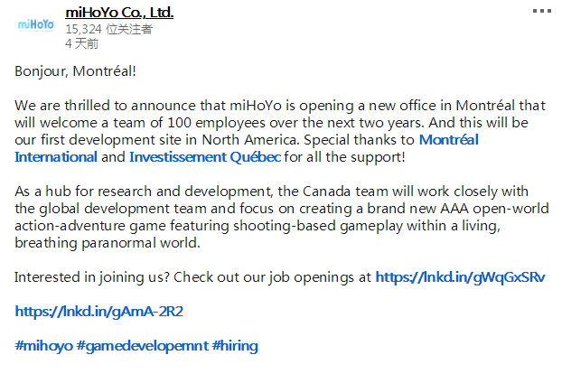 近日,米哈游在领英上发布了一项神秘3A开放世界游戏的招聘启事。从介绍来看,米哈游位于蒙特利尔的工作室正在开发一款3A级别的跨平台游戏,除了开放世界玩法以外,这款游戏还会加入一定的射击元素,而在未来两年,这家新成立的工作室将会扩建成为一个拥有100名员工的团队。