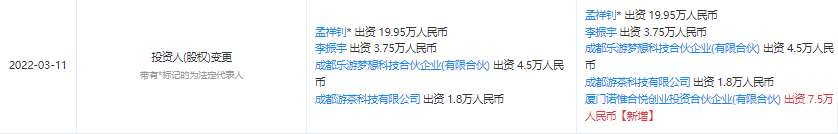企查查显示,近日,以吉比特和腾讯为主要出资人的“诺惟创投”入股成都乐游同创,持股20%,成为公司第二大股东,投资方还有乐游梦想科技(12%)、游戏茶馆(4.8%)等。